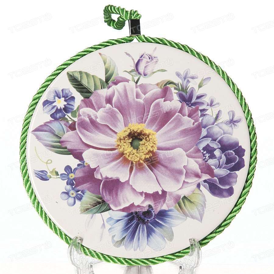 Круглая подставка под горячее выполнена из керамики с нанесением красочного цветочного рисунка. По краям подставка оформлена цветным канатным шнурком и петелькой, за которую вы сможете подвесить подставку на стену. Такая яркая подставка не только украсит ваш стол, но и сбережет его от высоких температур. Кроме того, благодаря своему оригинальному дизайну, она может просто служить украшением вашей кухни.