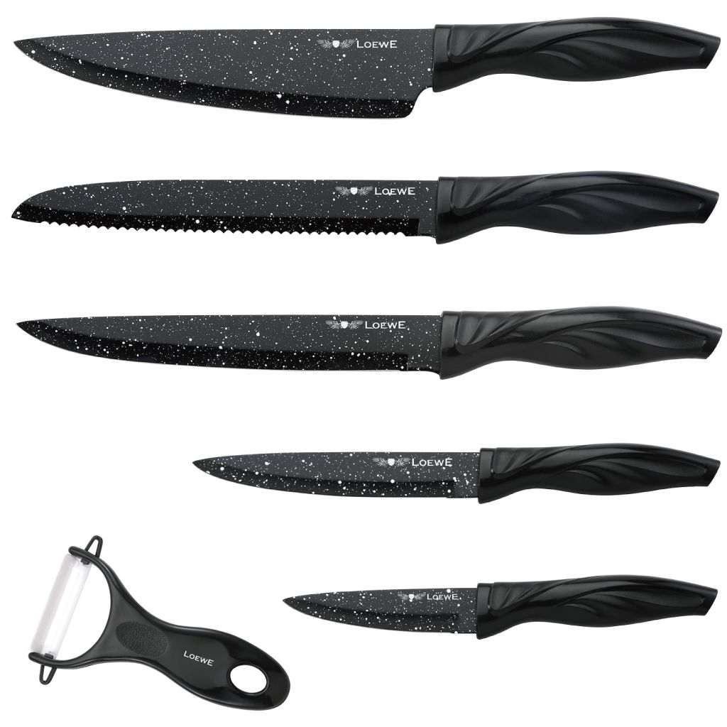 Набор ножей из 6 предметов Loewe LW-18120 - это отличное приобретение для готовки. Все ножи состоят из прочной углеродистой стали с нанесённым на него антибактериальным покрытием. Кромка лезвия очень острая и позволяет тонко нарезать продукты. Данные ножи не ржавеют и на них не остаются пятна. Такие Удобная рукоятка позволяет прочно держать ножи в руке. В комплекте идут все самые используемые на кухне предметы.