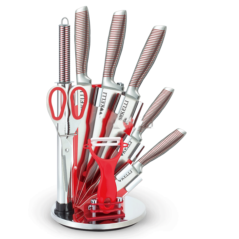 Дополнительные предметы в наборе | кухонные ножницы, овощечистка, подставка/колода, точило для ножей |