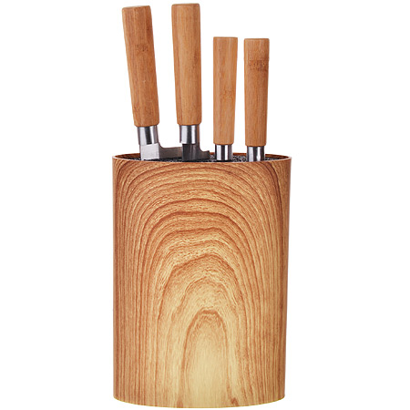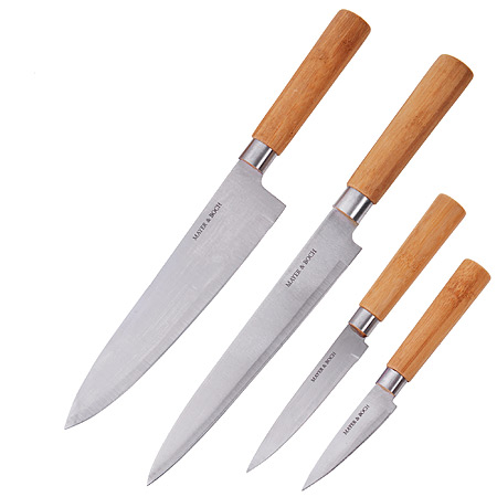 Набор ножей MAYER&BOCH состоит из 4-х ножей разного размера (поварского ножа, разделочного ножа и универсального ножа,нож для очистки), компактно складывающихся в оригинальную подставку-тубус из полипропилена. Лезвия выполнены из высококачественной нержавеющей стали, имеют износостойкую режущую кромку, благодаря чему ножи дольше остаются острыми, а эргономичные рукоятки ножей, выполненные из бамбука, обеспечивают безопасную работу и комфортное положение в руке. Это прекрасные ножи для ежедневной резки фруктов, овощей и мяса. Изделия имеют гладкую, легко очищаемую поверхность. Оригинальный дизайн набора и качество исполнения не оставят Вас равнодушными. Набор MAYER&BOCH станет великолепным подарком и отлично украсит интерьер Вашей кухни!