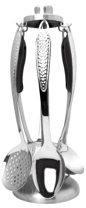 Набор кухонных принадлежностей Hoffmann HM-707B из 7 предметов из нержавеющей стали с бакелитовыми накладками на ручках. Имеет вращающуюся подставку. В набор входит: половник, шумовка, поварская ложка, поварская вилка, лопатка с прорезями, картофелемялка, подставка.