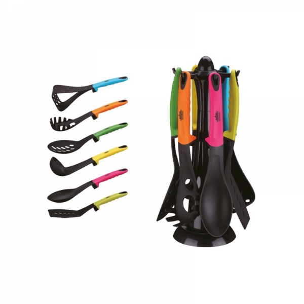 Набор кухонных принадлежностей Peterhof PH 12120 из 7пр. Ручки из цветного силикона. Подходит для антипригарного покрытия. В набор входит: половник, лопатка, ложка, шумовка, ложка для спагетти, картофелемялка, подставка из пластика.
