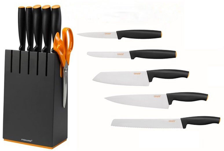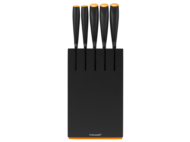 Набор ножей в блоке 5 штук серия Functional Form Прочное лезвие из нержавеющей стали. Эргономичная рукоятка с покрытием Softgrip. Твердость стали по Роквеллу: 53 HRC. Легко поддаются заточке. Можно мыть в посудомоечной машине, не требуют особого ухода. Материал блока: береза, цвет: черный. Дизайнерский блок для ножей из березы предназначен для компактного хранения ножей в вертикальном положении. Благодаря удобным прорезям для ножей, блок можно разместить под низкими навесными кухонными шкафчиками. Прочный магнит подходит для хранения ножниц Набор включает 5 ножей: нож для хлебаарт. 1014210 , общая длина 35 см, длина лезвия 23 см; нож поварской большой арт. 1014194, общая длина 32 см, длина лезвия 20 см; нож азиатский арт. 1014179, общая длина 29 см, длина лезвия 17 см; нож с зубчатым лезвием арт. 1014208, общая длина 23,5 см, длина лезвия 12 см; нож для чистки овощей арт. 1014205, общая длина 23 см, длина лезвия 11 см; *Ножницы в комплект не входят!