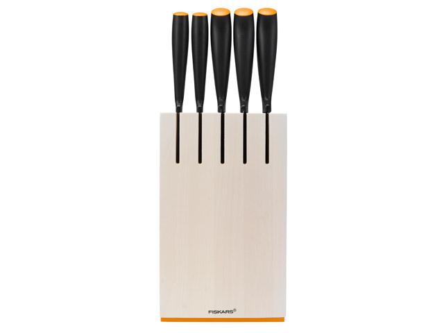 Набор ножей в блоке 5 штук серия Functional Form Прочное лезвие из нержавеющей стали. Эргономичная рукоятка с покрытием Softgrip. Твердость стали по Роквеллу: 53 HRC. Легко поддаются заточке. Можно мыть в посудомоечной машине, не требуют особого ухода. Материал блока: береза, цвет: белый. Дизайнерский блок для ножей из березы предназначен для компактного хранения ножей в вертикальном положении. Благодаря удобным прорезям для ножей, блок можно разместить под низкими навесными кухонными шкафчиками. Прочный магнит подходит для хранения ножниц. Набор включает 5 ножей: нож для хлебаарт. 1014210 , общая длина 35 см, длина лезвия 23 см; нож поварской большой арт. 1014194, общая длина 32 см, длина лезвия 20 см; нож азиатский арт. 1014179, общая длина 29 см, длина лезвия 17 см; нож с зубчатым лезвием арт. 1014208, общая длина 23,5 см, длина лезвия 12 см; нож для чистки овощей арт. 1014205, общая длина 23 см, длина лезвия 11 см; *Ножницы в комплект не входят!
