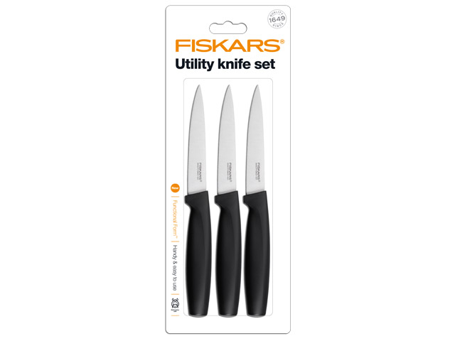Набор ножей для чистки и нарезки овощей, фруктов. Прочное лезвие из нержавеющей стали. Можно мыть в посудомоечной машине, не требуют особого ухода. Ручка ножа цвет: черный; Материал: нержавеющая сталь; Общая длина: 23 см; Длина лезвия: 11 см; В комплект входит 3 ножа для чистки.