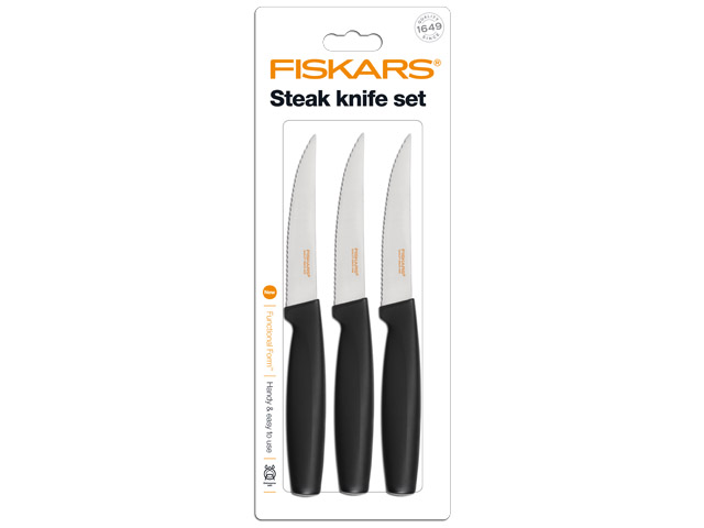Набор ножей для стейка с зубчатым лезвием. Прочное лезвие из нержавеющей стали. Можно мыть в посудомоечной машине, не требуют особого ухода. Ручка ножа цвет: черный; Материал: нержавеющая сталь; Общая длина: 23 см; Длина лезвия: 11 см; В комплект входит 3 ножа.