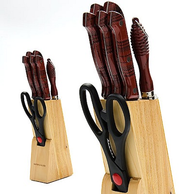 Набор ножей на деревянной подставке 8 предметов (длина лезвия): - нож поварской 15,2 см - нож хлебный 17,8 см - нож для выемки костей 13,3 см - нож универсальный 11,4 см - нож для очистки 8,9 см - ножницы 21,6 см - точилка 19 см - деревянная подставка