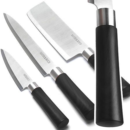 Набор ножей MAYER&BOCH состоит из 3-х универсальных ножей разного размера. Лезвия выполнены из высококачественной нержавеющей стали, имеют износостойкую режущую кромку, благодаря чему ножи дольше остаются острыми, а текстурные эргономичные рукоятки ножей, выполненные из черного каучука, обеспечивают безопасную работу и комфортное положение в руке. Это прекрасные ножи для ежедневной резки фруктов, овощей и мяса. Изделия имеют гладкую, легко очищаемую поверхность. Оригинальный дизайн набора и качество исполнения не оставят Вас равнодушными. Набор MAYER&BOCH станет великолепным подарком и отлично украсит интерьер Вашей кухни. Готовьте с удовольствием!