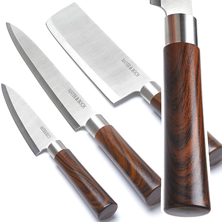 Набор ножей MAYER&BOCH состоит из 3-х универсальных ножей разного размера. Лезвия выполнены из высококачественной нержавеющей стали, имеют износостойкую режущую кромку, благодаря чему ножи дольше остаются острыми, а текстурные эргономичные рукоятки ножей, выполненные из черного каучука, обеспечивают безопасную работу и комфортное положение в руке. Это прекрасные ножи для ежедневной резки фруктов, овощей и мяса. Изделия имеют гладкую, легко очищаемую поверхность. Оригинальный дизайн набора и качество исполнения не оставят Вас равнодушными. Набор MAYER&BOCH станет великолепным подарком и отлично украсит интерьер Вашей кухни. Готовьте с удовольствием!