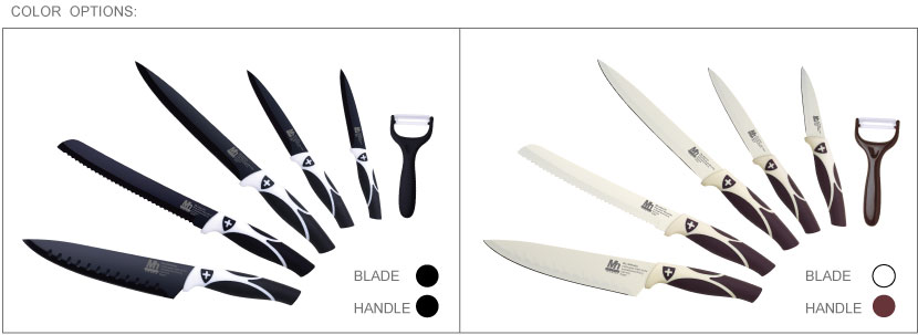 Набор ножей Millerhaus MH 5151 из 6 предметов. Нержавеющая сталь, ручки soft touch. В набор входит: поварской нож (20см), нож для хлеба (20см), нож для нарезки (20см), универсальный нож (12,5см), нож для овощей (8,75см), овощечистка.