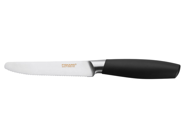 Нож с зубчатым лезвием для нарезания овощей и фруктов с тонкой кожурой. Идеальный баланс для аккуратной и легкой нарезки продуктов. Прочное лезвие из высококачественной нержавеющей стали. Можно мыть в посудомоечной машине, не требуют особого ухода. Материал: нержавеющая сталь; Общая длина: 23 см; Длина лезвия: 11 см;