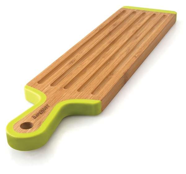 Материал: экологичный бамбук, обработанный специальным маслом и силикон лаймового цвета. Доска для нарезки хлеба BergHOFF имеет идеальную форму. Она была разработана, чтобы максимально облегчить процесс нарезки хлеба без рассыпания крошек по поверхности доски и стола. Эргономичная ручка удобна для захвата, что позволяет свободно удерживать доску в нужном наклоне при перемещении нарезанного хлеба в посуду. Отверстие на ручке позволяет хранить ее в подвешенном виде. Силиконовые накладки придают устойчивость доске, исключая ее скольжение по поверхности стола.
