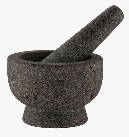 Когда требуется размельчить особо твердые ингредиенты или размолоть траву как можно мельче, каменной ступке альтернативы нет. Такая ступка очень устойчива, она не двигается на столе под руками даже при самом сильном воздействии. Преимущество ступки и пестика перед кофемолкой и мельницей состоит в том, что они позволяют растолочь очень маленькое количество приправы, необходимой для того или иного блюда. И только что размолотые пряности всегда свежие - а, значит, и аромат совсем другой.