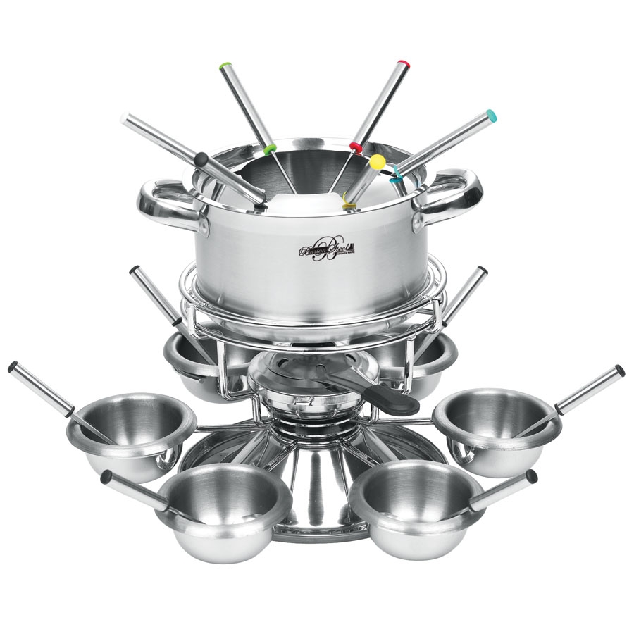 Набор для фондю рассчитан на 6 персон и выполнен из качественной нержавеющей стали. В комплект входит чаша для фондю, кольцо для шпажек, горелка с заслонкой, 6 шпажек и подставка. При помощи заслонки вы сможете регулировать интенсивность пламени. Красивый, с современным дизайном, этот набор будет прекрасно смотреться на столе и придаст вашему празднику, коктейльной вечеринке или романтическому ужину особое настроение. Используйте этот набор для приготовления сырного или сладкого фондю. Этот универсальный набор позволит каждому из ваших гостей побыть своим личным шеф-поваром. Подходит для мытья в посудомоечной машине.