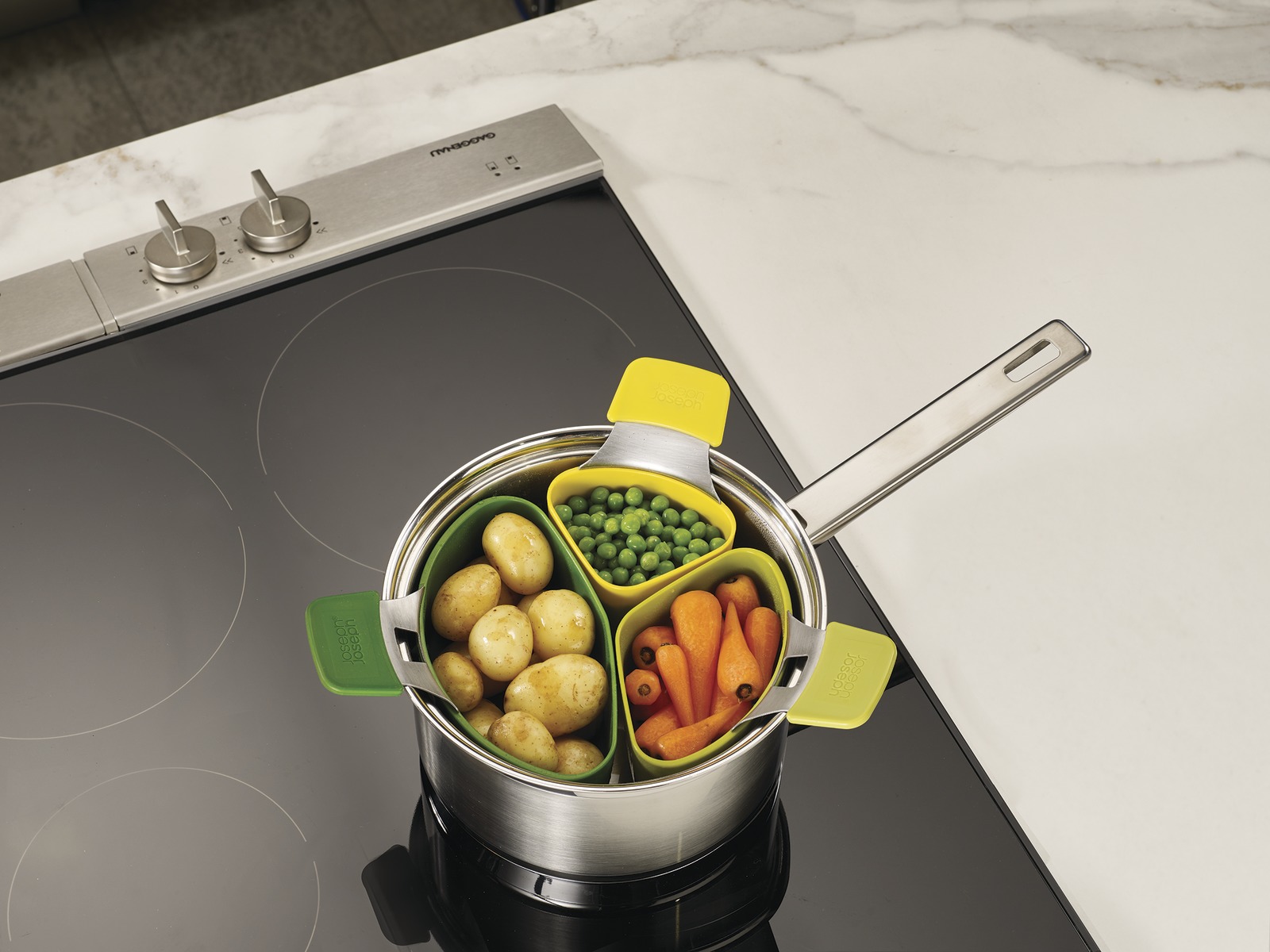 Набор из трех пароварок разного объема. Подойдут, когда нужно готовить небольшие порции разных продуктов одновременно. Крепятся на краю кастрюли зацепками. Хранятся компактно - вставляются друг в друга.<br> Хотите приготовить салат оливье, но не хочется отдельно варить картофель, морковь и горошек? Варите их в одной кастрюле, но по отдельности.<br> <br> Сверху накрывать крышкой.<br> Минимальный диаметр кастрюли, с которой можно использовать набор - 18 см. Минимальная глубина - 8 см.<br> Можно мыть в посудомоечной машине.<br> <br> Внимание! Всегда следите за тем, чтобы в кастрюле было достаточно воды для создания пара. Защищайте руки, когда снимаете готовую еду - ручки нагреваются!<br> <br>