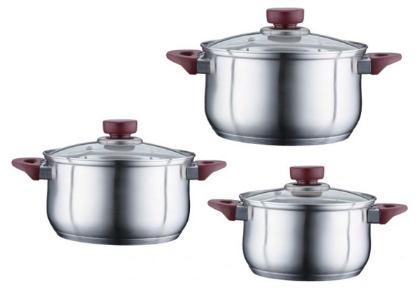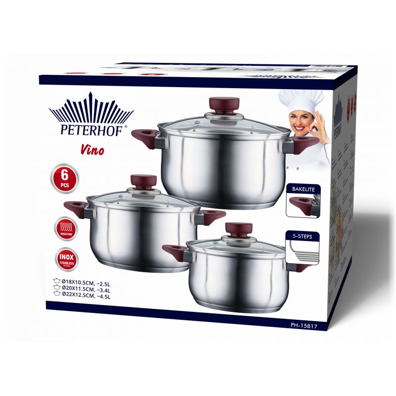Набор посуды из 6 предметов PETERHOF PH-15817. Высококачественная нержавеющая сталь 18/10. 5-и слойное дно с повышенной термоотдачей. Быстрый нагрев пищи, длительное удержание тепла. Подходит для всех типов плит: электрических, газовых, керамических, галогенных, индукционных. Ненагревающиеся бакелитовые ручки.