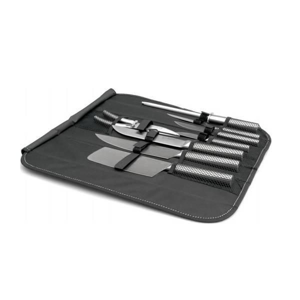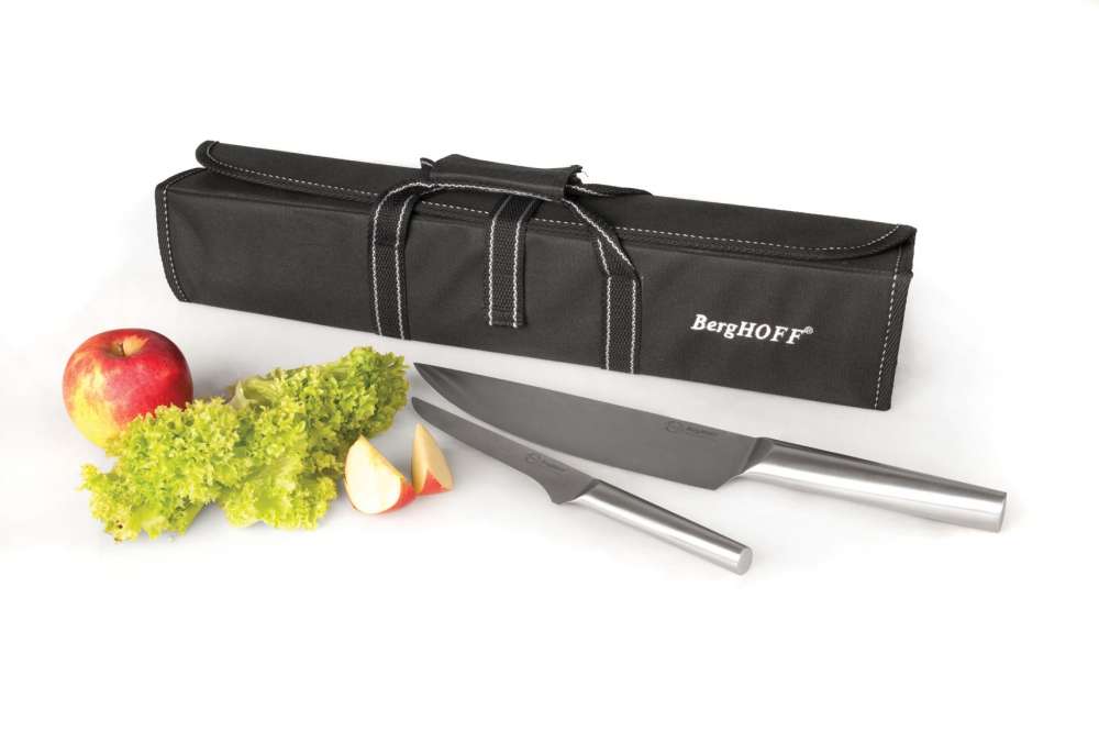 Ножи набора сделаны из нержавеющей стали х30Cr14. Литая конструкция ножа не имеет швов между ручкой и лезвием, что облегчает мытье ножей и предотвращает скапливание грязи между ручкой ножа и лезвием. Каждый нож хорошо сбалансирован и имеет знак качества BergHOFF. Вручную заточенное лезвие идет с сатиновой полировкой - это наиболее прогрессивная обработка поверхности металла. Поверхность с сатиновой полировкой приобретает «лощеный» вид и длительное время сохраняет прекрасный внешний вид. Сатинированная поверхность обладает способностью отражать малейший источник света и на ней гораздо менее заметны возникающие в ходе эксплуатации изъяны и повреждения. Черная нейлоновая складная сумка очень удобна для хранения набора ножей дома и незаменима для поездок на природу. Набор в сложенном виде не занимает много места в машине. Ручки складной сумки позволяют легко переносить набор. В набор входят все самые необходимые ножи, топорик для мяса и мусат из высокоуглеродистой стали.