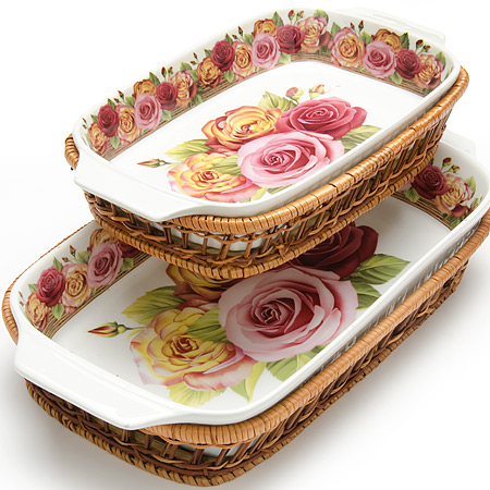 Набор прямоугольных форм MAYER&BOCH выполнен из качественного фарфора белого цвета. Поверхность украшена изображением цветов. К каждой форме прилагается плетеная корзинка из ротанга, выполняющая роль оригинальной подставки. Формы прекрасно подойдут для запекания овощей, мяса и других блюд, а благодаря своему оригинальному дизайну, они, несомненно, украсят ваш стол. Посуда не впитывает посторонние запахи, не имеет труднодоступных выступов или изгибов, которые накапливают грязь, и легко чистится. Фарфор выдерживает высокие перепады температуры, поэтому такие формы можно использовать в духовке, микроволновой печи, а также для хранения пищи в холодильнике. Подходит для мытья в посудомоечной машине. В комплекте: 2 формы, 2 плетеные корзинки.