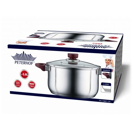 Кастрюля Peterhof PH 15821. Материал: нержавеющая сталь. Объем: 3.4 л. Диаметр: 20 см. Высота: 11.5 см. Крышка в комплекте: стеклянная. Ручка: бакелитовая. Совместимость с конфорками: газ, электро, стеклокерамика, индукция. Пригодность для посудомоечной машины: Да.