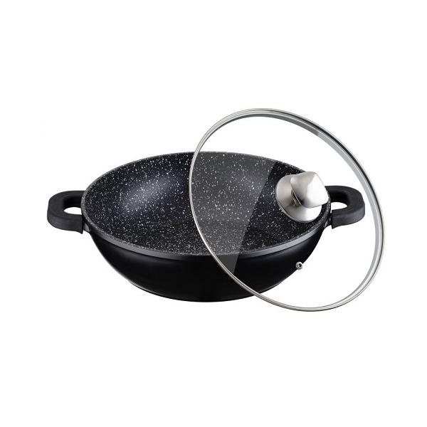 Вок-сковорода имеет антипригарное гранитное покрытие, которое убережёт Ваши блюда от пригорания. В такой сковороде можно быстро обжарить, используя минимум масла, тушить варить и даже готовить пищу на пару. За счёт высоких бортов во время приготовления и перемешивания, продукты остаются в пределах посуды и не разбрасываются по плите, а благодаря прозрачной стеклянной крышке Вам не понадобится лишний раз открывать ёмкость, чтобы проследить за стадиями готовности продуктов. Сковорода-вок сохраняет полезные качества блюд, за счёт того, что время готовки и термической обработки продуктов минимально.