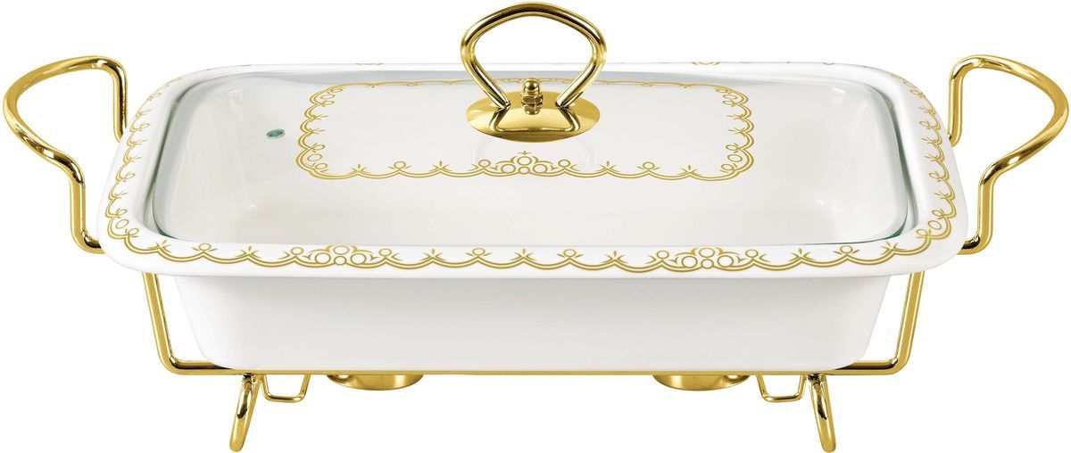 Прямоугольный мармит BK-7382 изготовлен из жаропрочной керамики. Он станет идеальным решением для праздничных застолий и семейных ужинов, которые не обходятся без горячих блюд. Изделие не только сохранит горячими приготовленные Вами блюда, но и украсит Ваш праздничный стол. Выполнено оно в изысканном дизайне и декорировано оригинальным орнаментом. Крышка мармита стеклянная с ручкой из нержавеющей стали и паровыпуском. Подставка металлическая под золото идет в комплекте. Изделие подходит для использования (без крышки) в СВЧ, в духовом шкафу, чистки в посудомоечной машине.