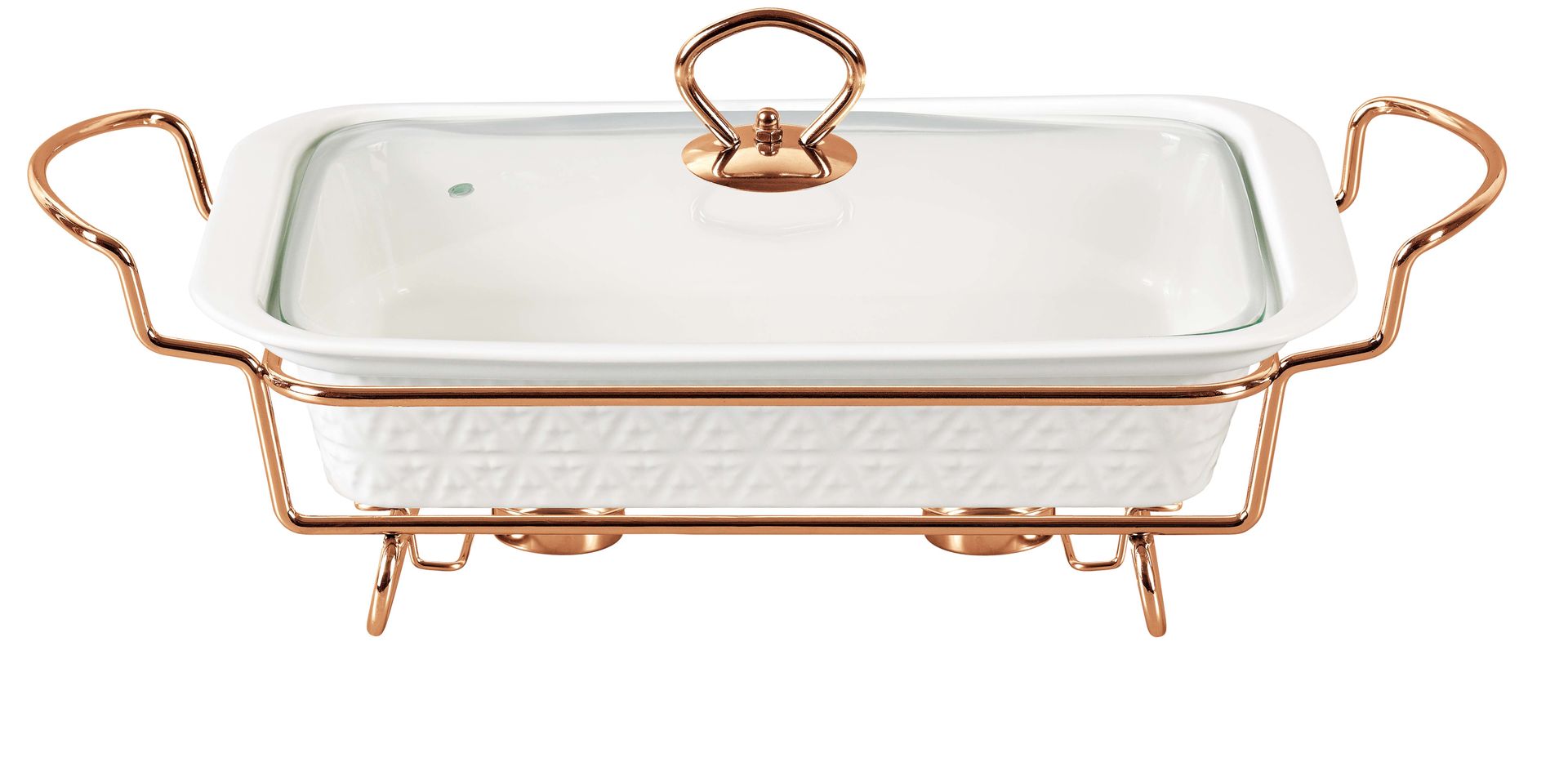 Крышка стеклянная с ручкой из нерж. стали под розовое золото. Подставка металлическая под розовое золото. Предназначен для приготовления и/или сохранения пищи в подогретом виде. Подходит для использования (без крышки) в СВЧ , в духовом шкафу, чистки в посудомоечной машине. Состав: жаропрочная керамика.