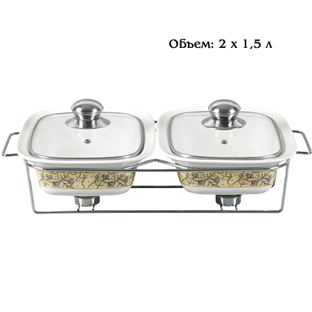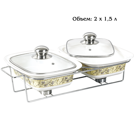 Керамический мармит GreenPoint GP-0254. Объем: 3,0л. 2 чаши по 1,5л. 2 свечи. Материал: керамика, стекло, хромированная подставка. Сохраняют еду теплой с помощью подогрева свечей. Подходит для запекания и подогрева блюд. Керамические блюда подходят для духовки. Можно мыть в посудомоечной машине. Элегантный дизайн.