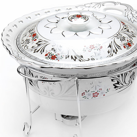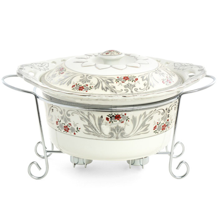 Мармит LORAINE выполнен из керамики белого цвета, украшенной рисунком. Керамическая чаша с удобными ручками располагается на стальной подставке с двумя подсвечниками для чайных свечей (входят в комплект). Свечи, устанавливающиеся на подставке, нагревают чашу снизу, таким образом поддерживая нужную температуру приготовленного блюда. Керамическая крышка с удобной ручкой плотно прикрывает чашу сверху, в свою очередь также не давая остыть блюду. Благодаря своему элегантному дизайну, мармит с приготовленным блюдом можно сразу подавать на стол, не перекладывая еду на сервировочные тарелки. Изящный, с современным дизайном, мармит украсит любой праздничный стол, а блюда в нем будут всегда теплыми и ароматными. Керамическая чаша (без подставки) подходит для использования в духовом шкафу и микроволновой печи. Подходит для мытья в посудомоечной машине. Подходит для хранения в холодильнике.