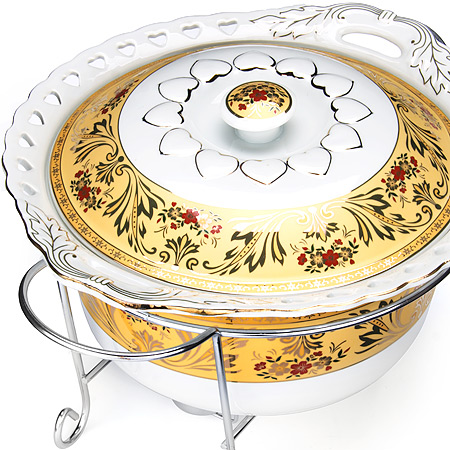 Мармит LORAINE выполнен из керамики белого цвета, украшенной рисунком. Керамическая чаша с удобными ручками располагается на стальной подставке с двумя подсвечниками для чайных свечей (входят в комплект). Свечи, устанавливающиеся на подставке, нагревают чашу снизу, таким образом поддерживая нужную температуру приготовленного блюда. Керамическая крышка с удобной ручкой плотно прикрывает чашу сверху, в свою очередь также не давая остыть блюду. Благодаря своему элегантному дизайну, мармит с приготовленным блюдом можно сразу подавать на стол, не перекладывая еду на сервировочные тарелки. Изящный, с современным дизайном, мармит украсит любой праздничный стол, а блюда в нем будут всегда теплыми и ароматными. Керамическая чаша (без подставки) подходит для использования в духовом шкафу и микроволновой печи. Подходит для мытья в посудомоечной машине. Подходит для хранения в холодильнике.
