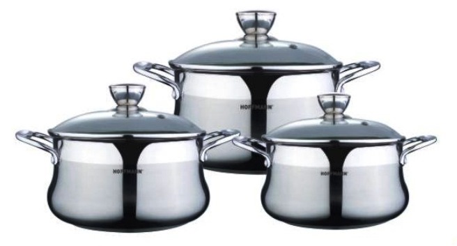 Набор кастрюль из 6 предметов из нержавеющей стали с 3-х слойным термоаккумулирующим капсулированным дном (технология сендвич, алюминиевая крошка). Толщина стенок кастрюль составляет 0,6мм. Крышки из закаленного стекла с отверстием для паровыпуска. В набор входит кастрюля с крышкой объемом 5,9л размером 24х12см, кастрюля с крышкой 4,1л, -20х11см, кастрюля с крышкой 3,1л, -18х10см. Подходит для всех видов плит. Можно мыть в посудомоечной машине.