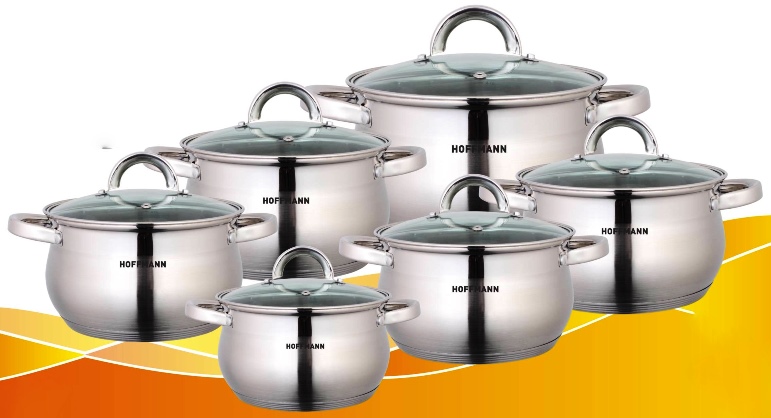 Набор кастрюль из 12 предметов из нержавеющей стали с 5-ти слойным термоаккумулирующим капсулированным дном (технология сендвич, алюминиевая крошка). Толщина стенок 0,6мм. Крышки из закаленного стекла с отверстием для паровыпуска. Подходит для всех видов плит.