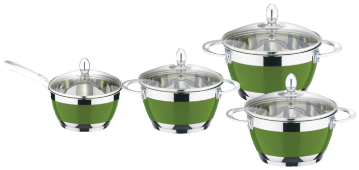 Люксовый набор посуды от производителя Green Point включает в себя 8 предметов: 3 кастрюли со стандартными ручками, 1 кастрюля-ковш с длинной ручкой, 4 крышки. В наборе Green Point есть всё самое необходимое для готовки на кухне! Кастрюли сделаны из нержавеющей стали высочайшего качества и отполированы по специальной технике, благодаря чему сияние и блеск останутся на долгие годы.