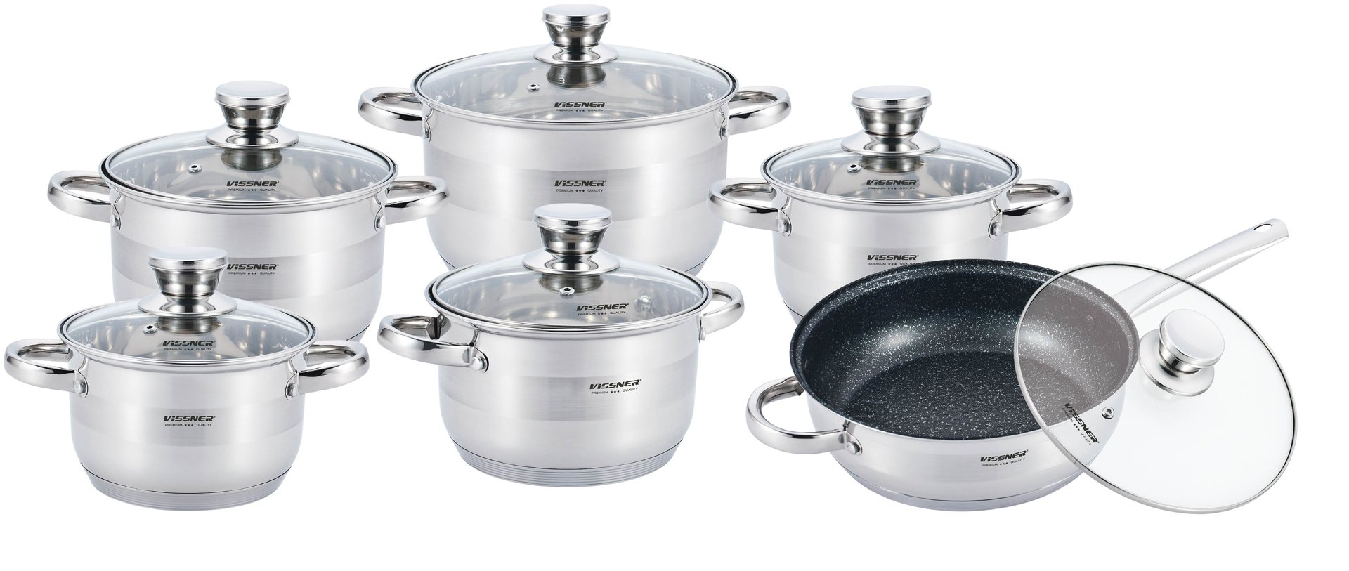 Набор кастрюль от компании Vissner изготовлен из нержавеющей стали высокого качества. Это специальный материал для изготовления посуды, отвечающий всем требованиям качества и безопасности, поэтому готовить в таких кастрюлях можно не опасаясь за свое здоровье, а сами кастрюли даже при длительной эксплуатации не утратят своего вида.