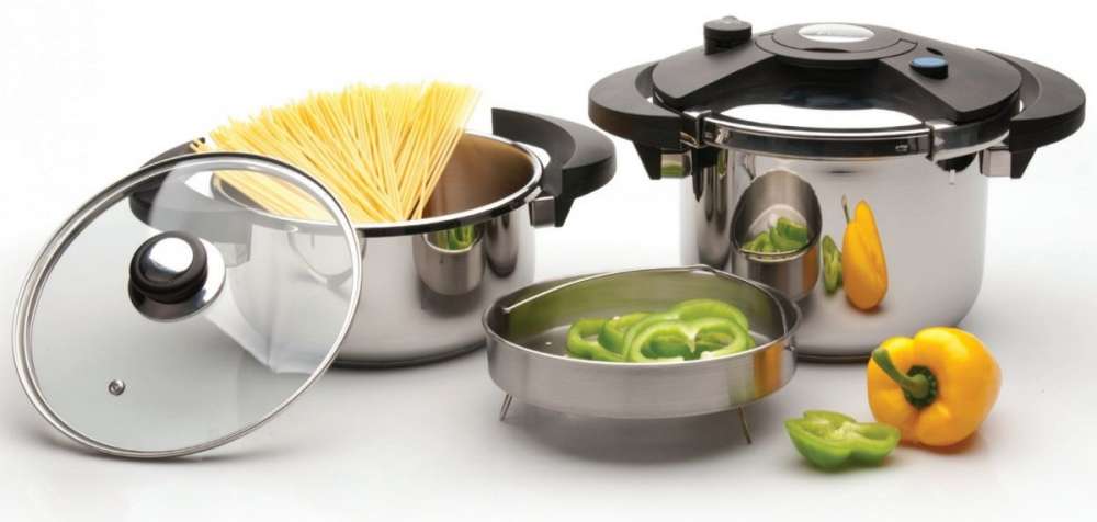 В 5 предметный набор Eclipse входят 2 скороварки диаметром 22 см на 6 л и 3 л с разметкой литража. Стеклянная крышка и крышка из нержавеющей стали подходят для скороварки на 3 л и для скороварки на 6 л. Съемную пароварку можно использовать как дуршлаг для мытья овощей. Материал корпуса: высококачественная нержавеющая сталь 18/10 с зеркальной полировкой. Крышка из нержавеющей стали с силиконовым ободком. Крышка стеклянная с ободком из нержавеющей стали и отверстием для выхода пара. Эргономичные черные пластиковые (фенольные) ручки. Материал клапана: нейлон. 3-х слойное капсульное дно. Посуда подходит для всех видов плит, включая индукционные. Корпус скороварки подходит для посудомоечной машины. Внимание! Крышку нельзя мыть в посудомоечной машине! Набор упакован в фирменную коробку.
