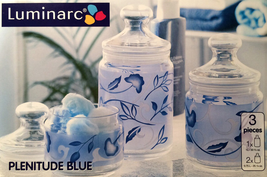 Банки для сыпучих продуктов PLENITUDE BLUE (пленитюд синий) 3пр. Объём: 0,75л х 2 шт, 1л х 1 шт. Материал: упрочненное стекло. Срок годности не ограничен. Выдерживает резкий перепад температур до 135°С. Можно использовать в СВЧ печах.