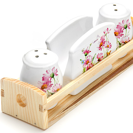 Набор для специй LORAINE состоит из солонки, перечницы, салфетницы и деревянной подставки. Предметы набора выполнены из доломитовой керамики высокого качества и красиво оформлены. Отверстия, в которые засыпаются специи, закрыты силиконовыми пробками. Благодаря своим небольшим размерам набор не займет много места на вашей кухне. Дизайн, эстетичность и функциональность набора позволят ему стать достойным дополнением к кухонному инвентарю.
