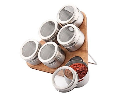 Набор для специй Peterhof PH 12787. Высококачественная нержавеющая сталь 18/10. Деревянная подставка. Регулируемые отверстия. Магнитные держатели. 7 предметов: 6 емкостей для специй и подставка.