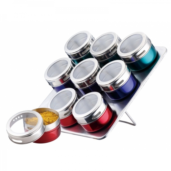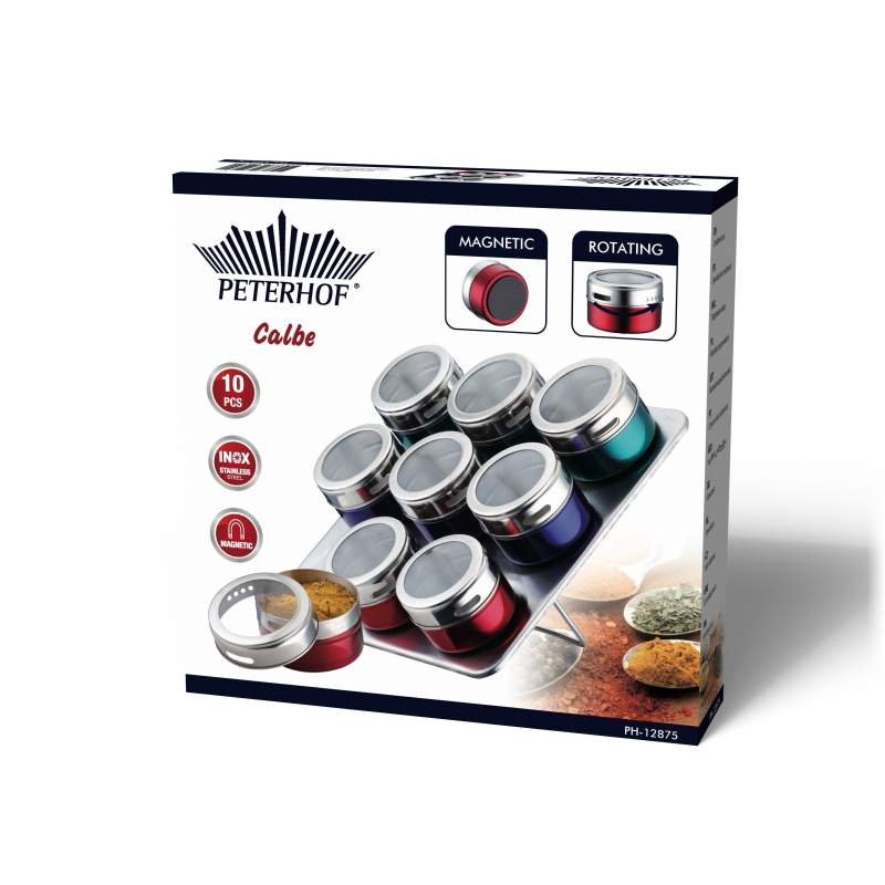 Набор для специй Peterhof PH-12875. Высококачественная нержавеющая сталь 18/10. Регулируемые отверстия. Магнитные держатели. 10 предметов: 9 цветных емкостей для специй, подставка.