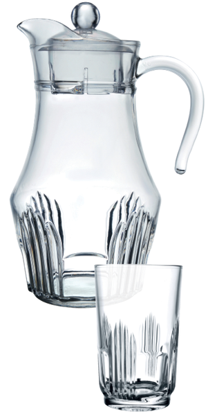 Набор стаканов по 270 мл. с графином 1,6 литра и крышкой. Материал: Стекло. Фактура: Рельефная. Без рисунка. Кол-во предметов: 7 (6 стаканов + 1 кувшин).