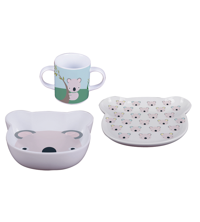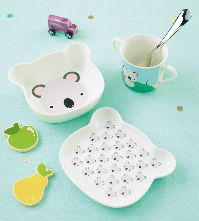 С яркими коллекциями посуды любой детский обед или ужин будет наполнен настоящими приключениями. Дизайн посуды отличается веселыми графическими формами и яркими цветами. Главными героями наборов являются собака, котенок, мишка коала, самолет и велосипед – как дань самым любимым детским развлечениям и играм. Набор включает 3 предмета: столовая, глубокая тарелки и кружка с двумя ручками, которую очень удобно держать.