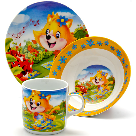 Предметы набора выполнены из высококачественной керамики и декорированы красочным рисунком. Изделия легкие и функциональные. Такой набор обязательно понравится вашему ребенку, потому что теперь у него будет своя собственная посуда с ярким и оригинальным детским рисунком. Набор посуды для детей включает в себя три предмета: суповую тарелку, обеденную тарелку и кружку. Набор упакован в красочную, подарочную упаковку. Подходит для мытья в посудомоечной машине. Для детей от 3-х лет.