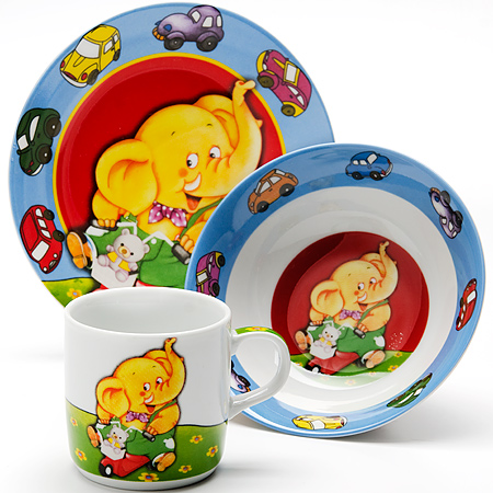 Предметы набора выполнены из высококачественной керамики и декорированы красочным рисунком. Изделия легкие и функциональные. Такой набор обязательно понравится вашему ребенку, потому что теперь у него будет своя собственная посуда с ярким и оригинальным детским рисунком. Набор посуды для детей включает в себя три предмета: суповую тарелку, обеденную тарелку и кружку. Набор упакован в красочную, подарочную упаковку. Подходит для мытья в посудомоечной машине. Для детей от 3-х лет.