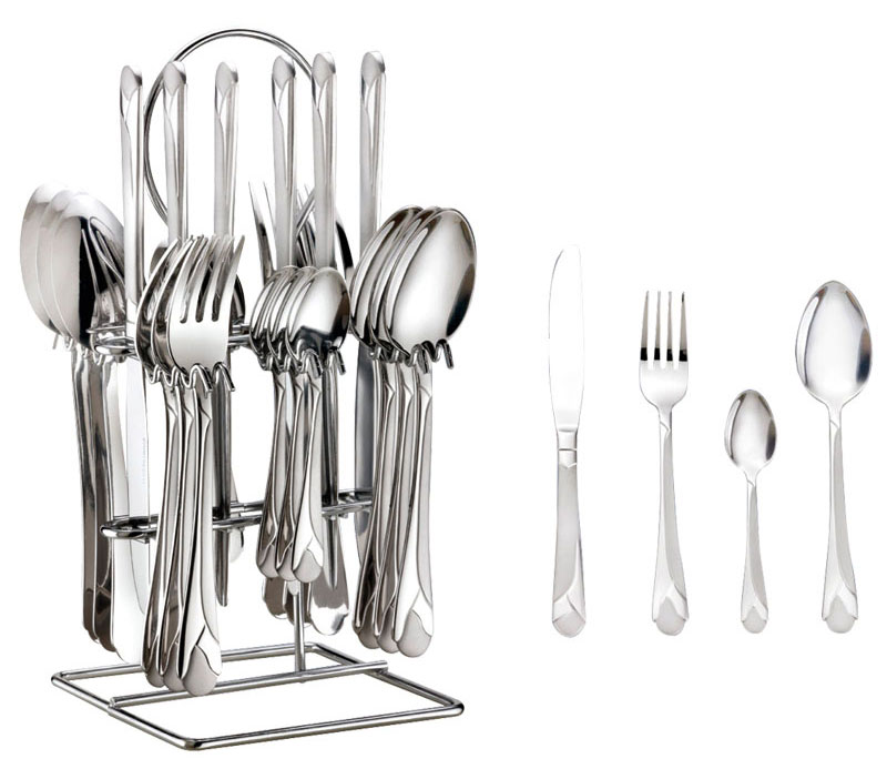 Набор столовых приборов выполнен из прочной нержавеющей стали. В набор входит 25 предметов: 6 обеденных ножей, 6 обеденных ложек, 6 обеденных вилок и 6 чайных ложек и подставка. Приборы имеют оригинальные удобные ручки с оригинальным узором. Прекрасное сочетание свежего дизайна и удобство использования предметов набора придется по душе каждому. Предметы набора расположены на подставке из стали, набор на каждую персону имеет отдельную секцию. Подставка оснащена удобной ручкой для переноски. Набор столовых приборов подойдет для сервировки стола, как дома, так и на даче и всегда будет важной частью трапезы, а также станет замечательным подарком.