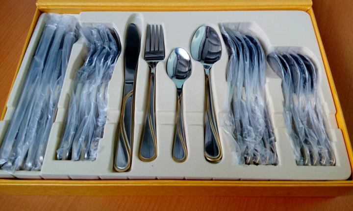 Столовые приборы изготавливается из высококачественной хромникелевой стали. Столовые наборы из нержавеющей стали такого состава отличается высокими антикоррозионными свойствами, значительной устойчивостью к воздействию кислот и щелочей. Не изменяет вкус и цвет пищи, не выделяет вредных веществ. Элегантные золотые узоры на столовых приборах выполнены по технологии плазменного напыления, обеспечивающего высокую износостойкость покрытия.