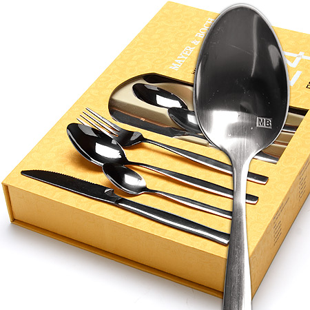 Набор столовых приборов MAYER&BOCH на 6 персон выполнен из высококачественной нержавеющей стали, ручки приборов имеют глянцевую полировку. Набор из 24-х предметов включает в себя: 6 столовых ложек, 6 вилок, 6 ножей и 6 чайных ложек. Благодаря качественной полировке, изделия сохраняют прекрасный внешний вид на долгое время. Набор обладает не только оригинальным дизайном, но и практичностью, так как изделия из качественной нержавеющей стали имеют высокую прочность, устойчивость к коррозии, кроме того, нержавеющая сталь экологична, она не меняет вкусовые свойства еды, потому как не вступает в реакцию с ее компонентами. Упакованный в красочную подарочную коробку такой набор безусловно станет прекрасным подарком для любой хозяйки и украсит ваш праздничный стол. Подходит для мытья в посудомоечной машине.