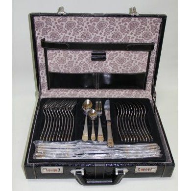 Набор столовых приборов из нержавеющей стали на 12 персон из 72 предметов. Набор VH 3006 упакован в подарочный дипломат с отделкой под кожу. В составе набора: столовые ложки -12 пр, столовые вилки — 12пр, чайные ложки- 12пр, столовые ножи- 12пр, десертные вилки — 12пр, вилка для мяса — 2пр, ложка сервировочная — 2 пр, ложка для салата — 2пр, ложка для сахара — 1шт, щипцы для сахара — 1шт, ложка для мороженного — 1 шт, лопатка — 1шт, половник — 1 шт, половник для соуса — 1 шт. Глянцевая полировка поверхности.