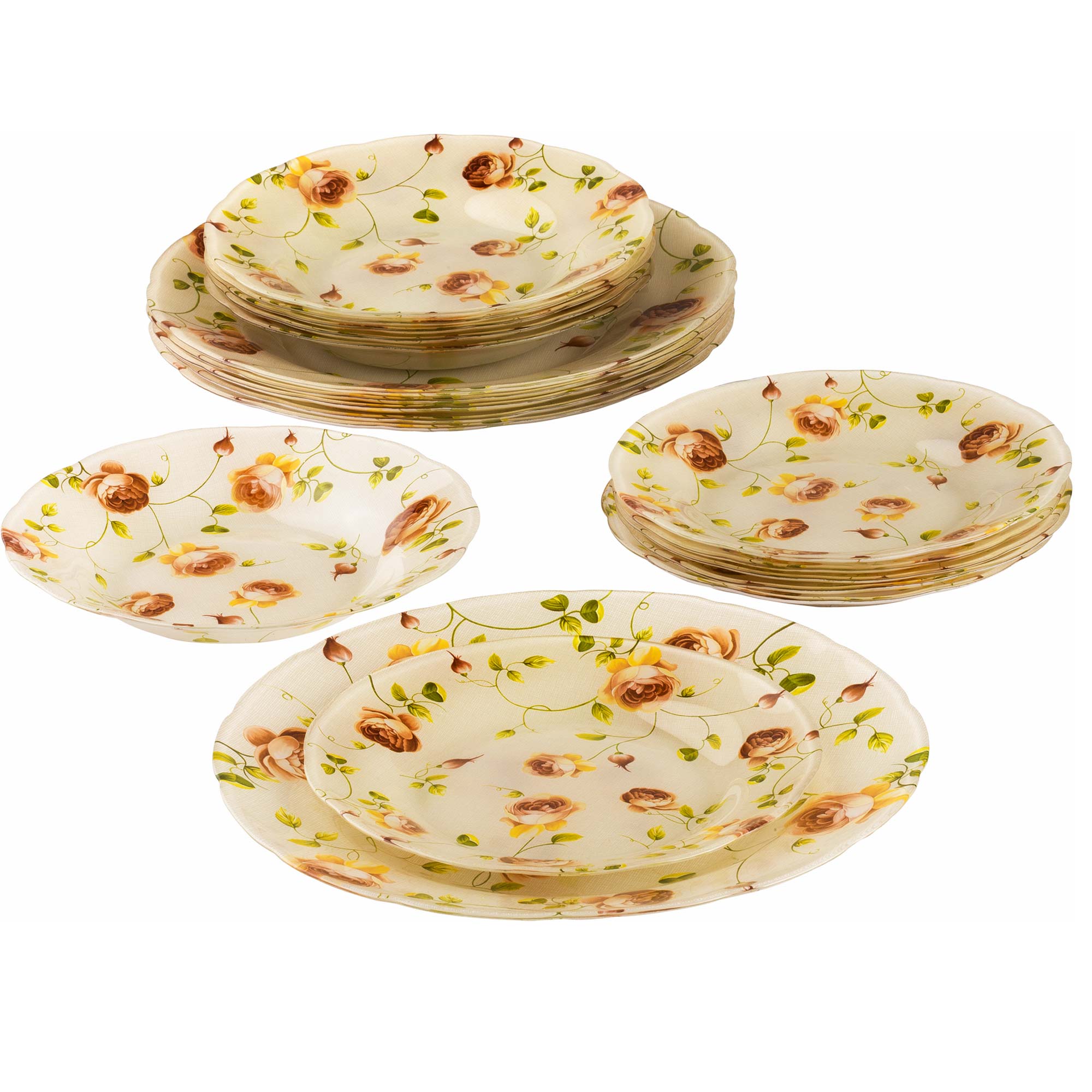 Обеденный сервиз из 18 предметов на 6 персон Bekker BK-9907 изготовлен из высококачественного стекла. Такой сервиз придется по вкусу любителям классики, и тем, кто предпочитает утонченность и изысканность. Набор эффектно украсит стол к обеду, а также прекрасно подойдет для торжественных случаев. Можно использовать в СВЧ-печи. Можно мыть в посудомоечной машине.