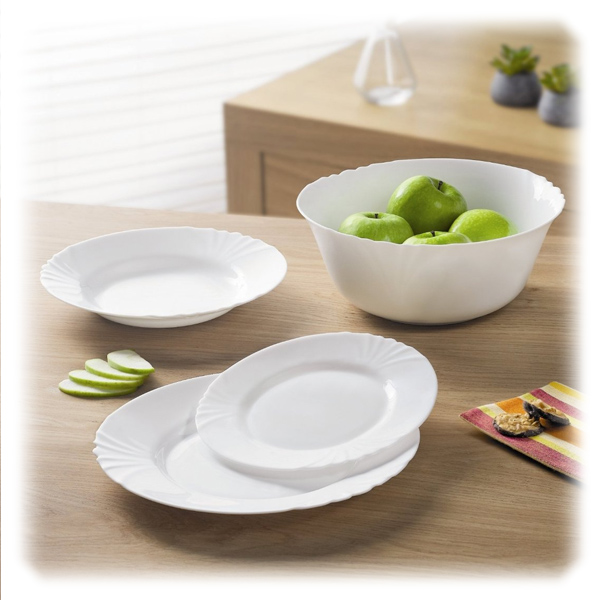 Столовая посуда Luminarc изготавливается из закаленного стекла, в процессе изготовления упрочняясь более чем в три раза по сравнению со стандартным стеклом. Так же к плюсам данного материала можно отнести абсолютно гладкую поверхность, препятствующую проникновению бактерий и посторонних запахов в посуду. Посуду Luminarc можно использовать в микроволновой печи, а так же мыть в посудомоечной машине. Посуду Luminarc разработана для постоянного использования, рисунок не теряет яркость, поверхность отлично держит тепло.