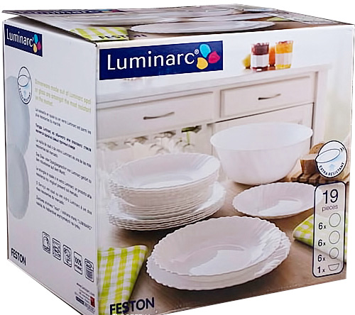 Столовая посуда Luminarc изготавливается из закаленного стекла, в процессе изготовления упрочняясь более чем в три раза по сравнению со стандартным стеклом. Так же к плюсам данного материала можно отнести абсолютно гладкую поверхность, препятствующую проникновению бактерий и посторонних запахов в посуду. Посуду Luminarc можно использовать в микроволновой печи, а так же мыть в посудомоечной машине. Посуда Luminarc разработана для постоянного использования, рисунок не теряет яркость, поверхность отлично держит тепло.