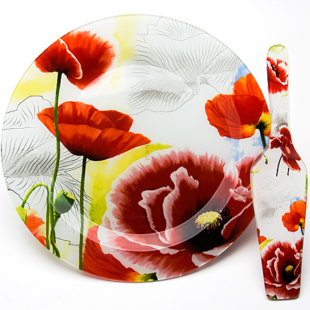 Тортовница MB 23901, материал - стекло, диаметр 30см, длина лопатки 26 см. Набор для торта состоит из двух предметов: блюда круглой формы и лопатки. Предметы набора выполнены из стекла и декорированы ярким рисунком. Изящный дизайн и красочность оформления придутся по вкусу и ценителям классики, и тем, кто предпочитает утонченность и изысканность. Набор для торта упакован в красивую коробку.